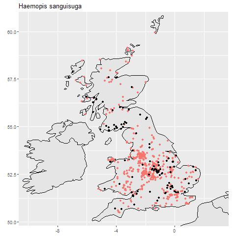 Red dots are historical (> 10 years old), black dots current (<= 10 years old).